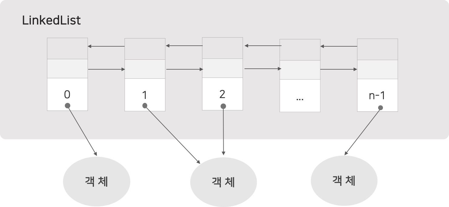ArrayList는 내부 배열에 객체를 저장해서 인덱스로 관리하지만, LinkedList는 인접 참조를 링크해서 체인처럼 관리한다.