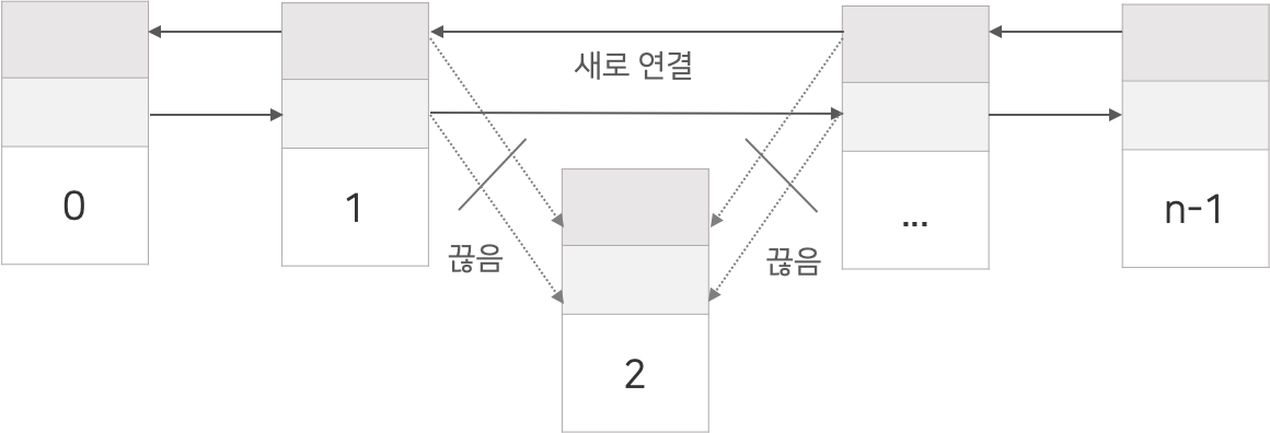 LinkedList에서 특정 인덱스의 객체를 제거하면 앞뒤 링크만 변경되고 나머지 링크는 변경되지 않는다.