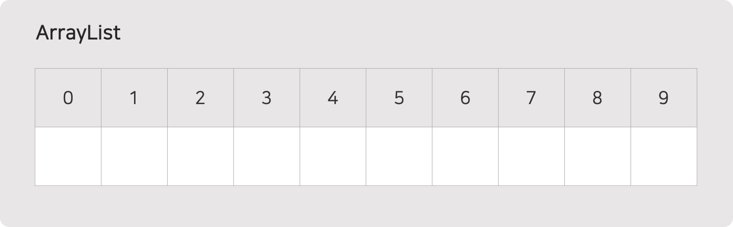 기본 생성자로 ArrayList 객체를 생성하면 내부에 10개의 객체를 저장할 수 있는 초기 용량(capacity)을 가지게 된다.
