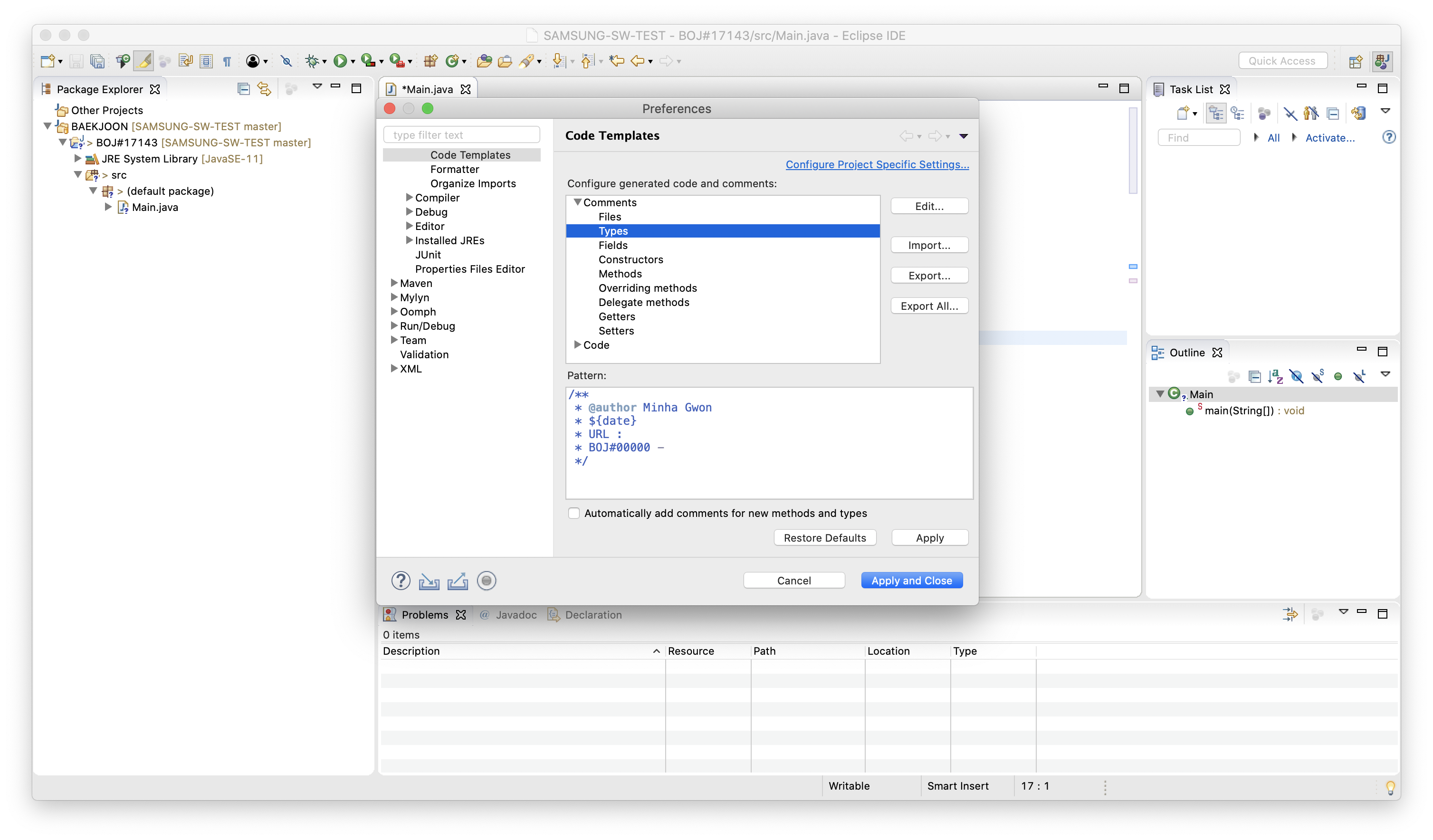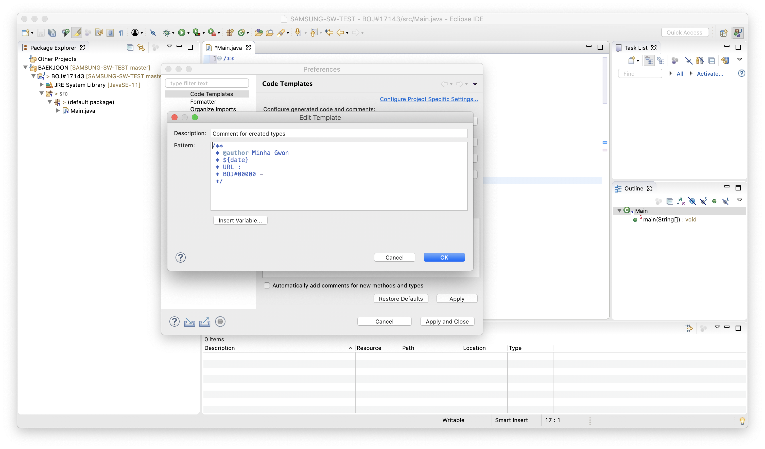 (자세히 : 상단 맨 왼쪽 사과 옆 Eclipse -> 환경설정 Preferences -> Java -> Code Style -> Code Templates -> Comments)