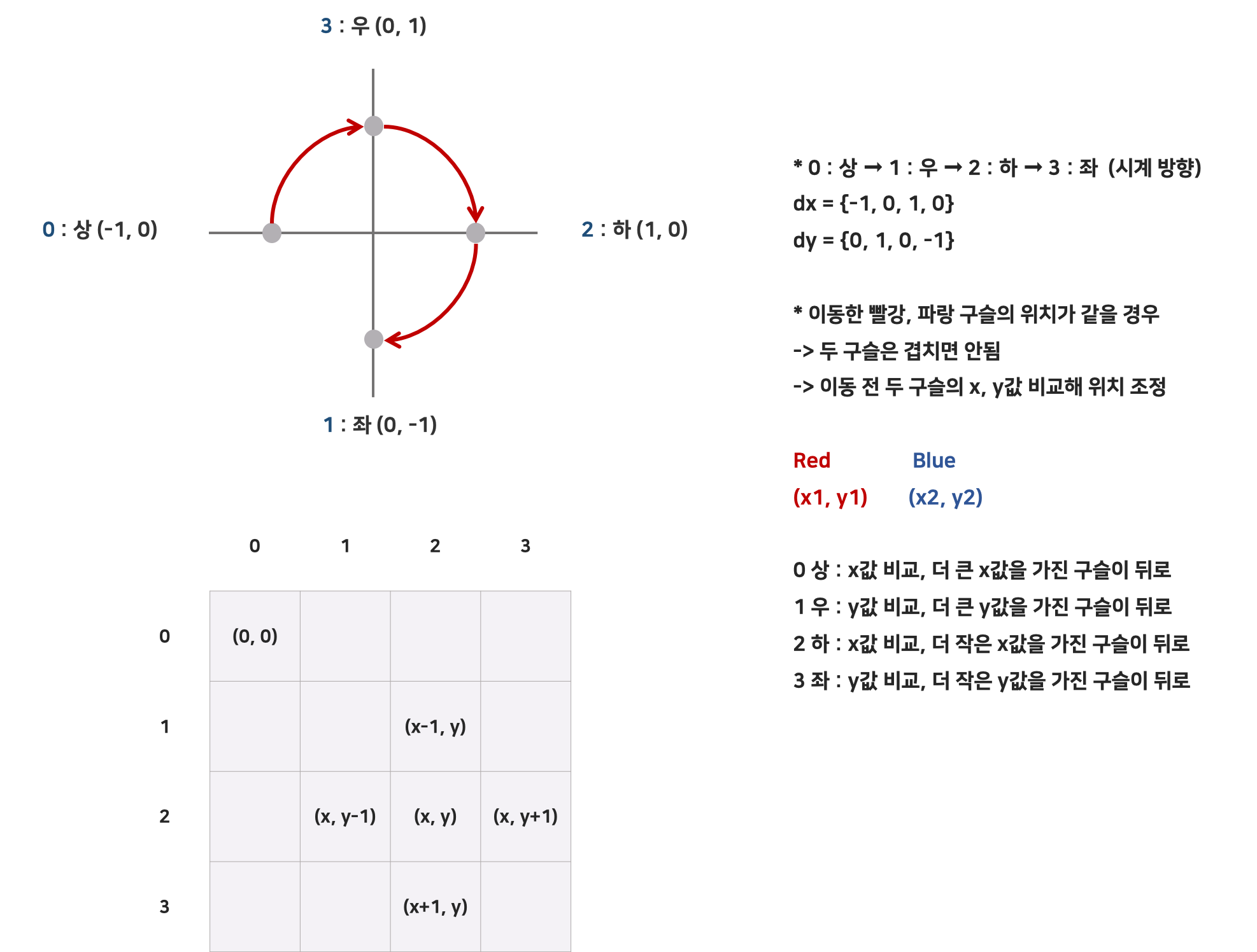 처음엔 빨간 파랑 구슬 중 빨강만 고려해 틀리기도 하고, 둘의 위치가 만나면 어떻게 처리해야 하는지의 문제로 머리가 아팠다.