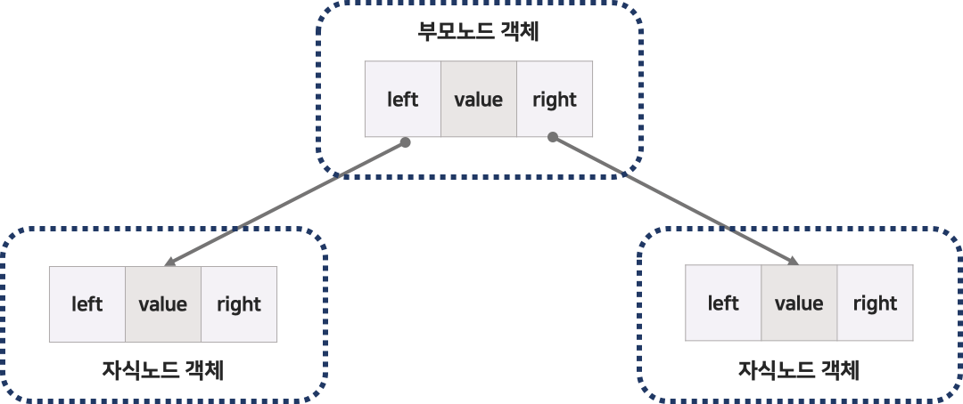 하나의 노드는 노드 값인 value와 왼쪽과 오른쪽 자식 노드를 참조하기 위한 두 개의 변수로 구성된다.
