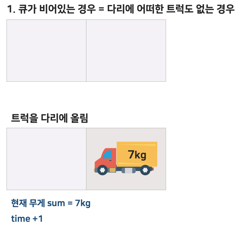 큐가 비어있는 경우는 다리에 어떠한 트럭도 올라가지 않은 경우와 같다.