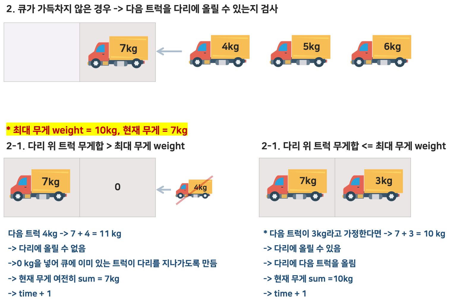 이 때는 이미 다리에 있는 트럭의 무게와 다리에 올릴 다음 트럭의 무게를 비교해 다리에 올릴지 말지를 결정해야 한다.