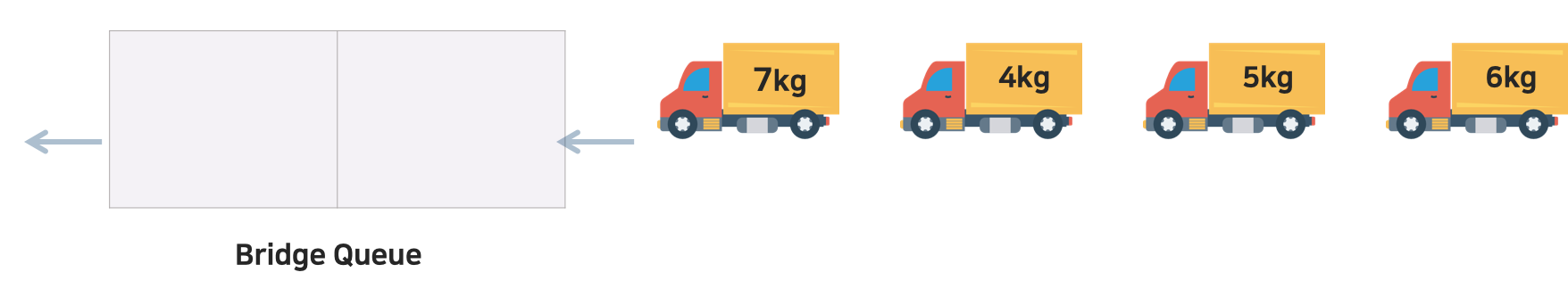 다리를 나타내는 큐가 있고, 7, 4, 5, 6kg의 트럭이 순차적으로 다리를 지나갈 것이다.