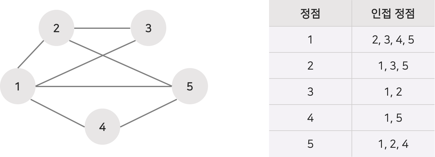ex) 정점 1의 인접 정점은 2, 3, 4, 5이며 차수는 4이다.
