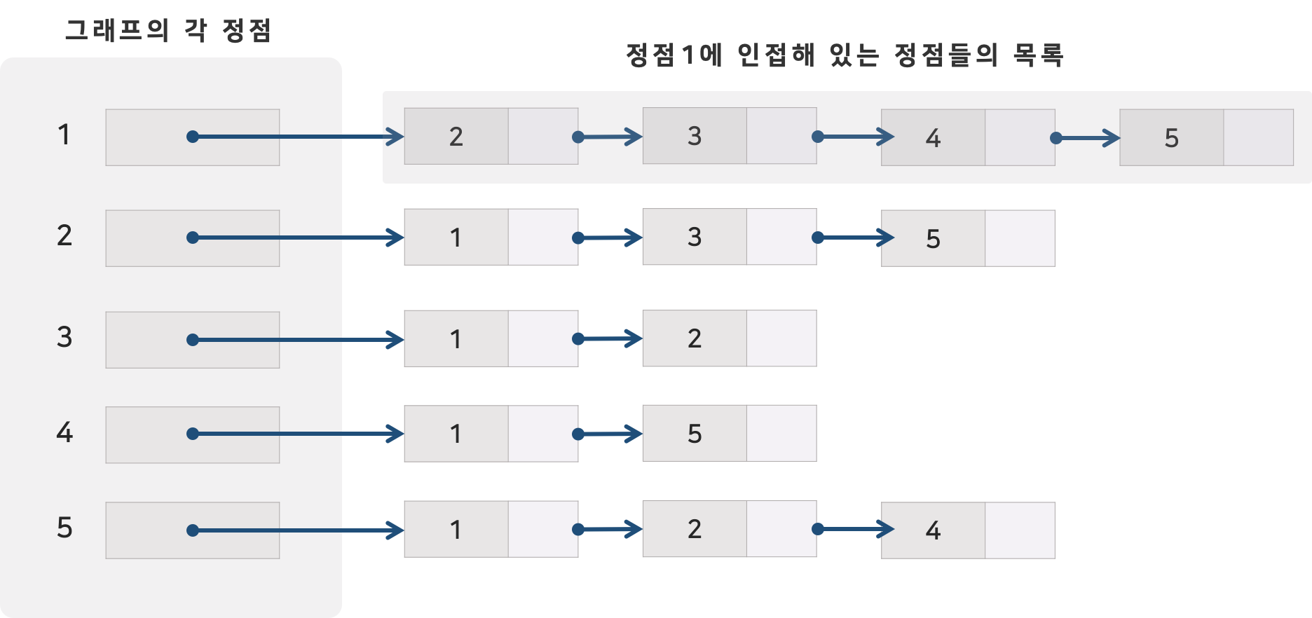 모든 정점을 죽 늘어놓고 각 정점의 인접 정점을 옆에 나열하면 된다.