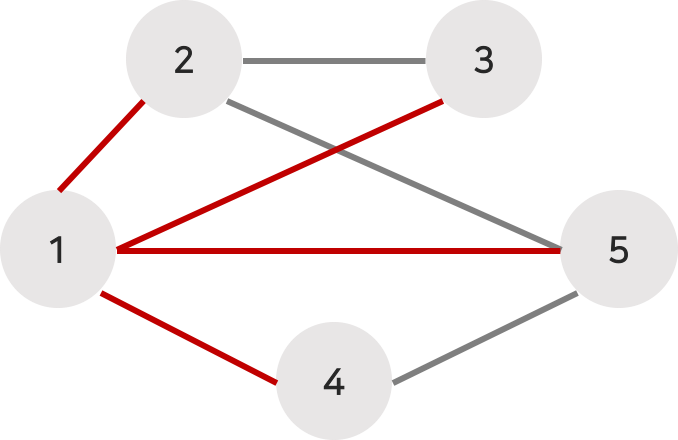 예를 들어 정점 1은 정점 2, 3, 4, 5와 인접해 있으니 (1, 2), (1, 3), (1, 4), (1, 5)는 모두 1이다.