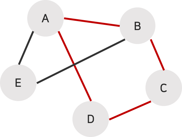 (A, B), (A, D), (A, E), (B, C), (B, E), (C, D)가 서로 이웃 관계에 있다.