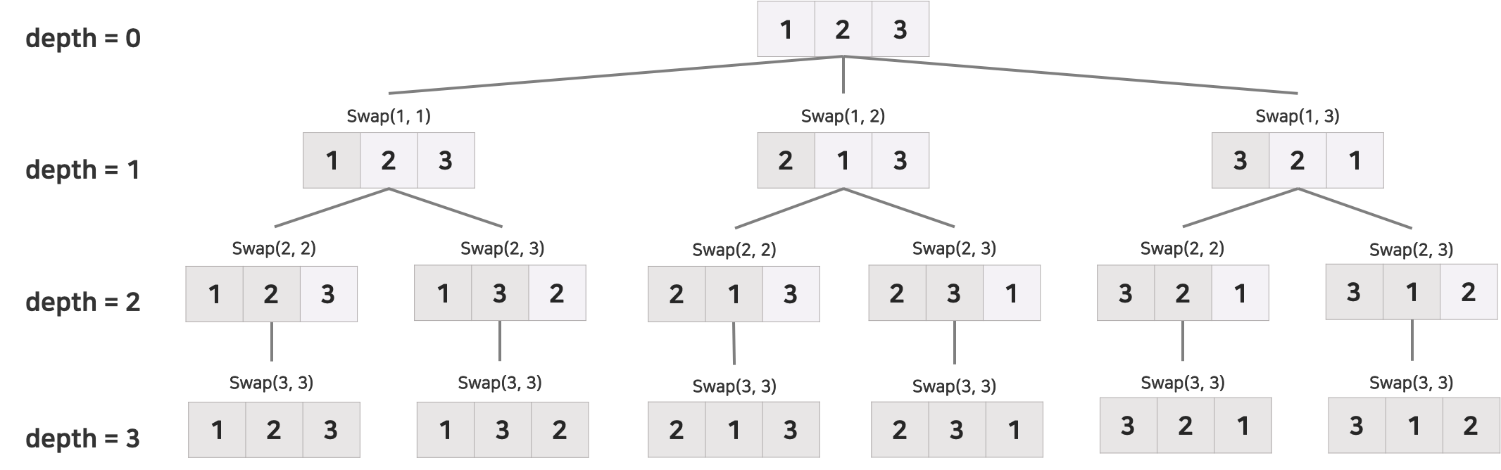 depth를 기준 인덱스로 하여 depth 보다 인덱스가 작은 값들은 그대로 고정하고, depth 보다 인덱스가 큰 값들만 가지고 다시 swap을 진행한다.