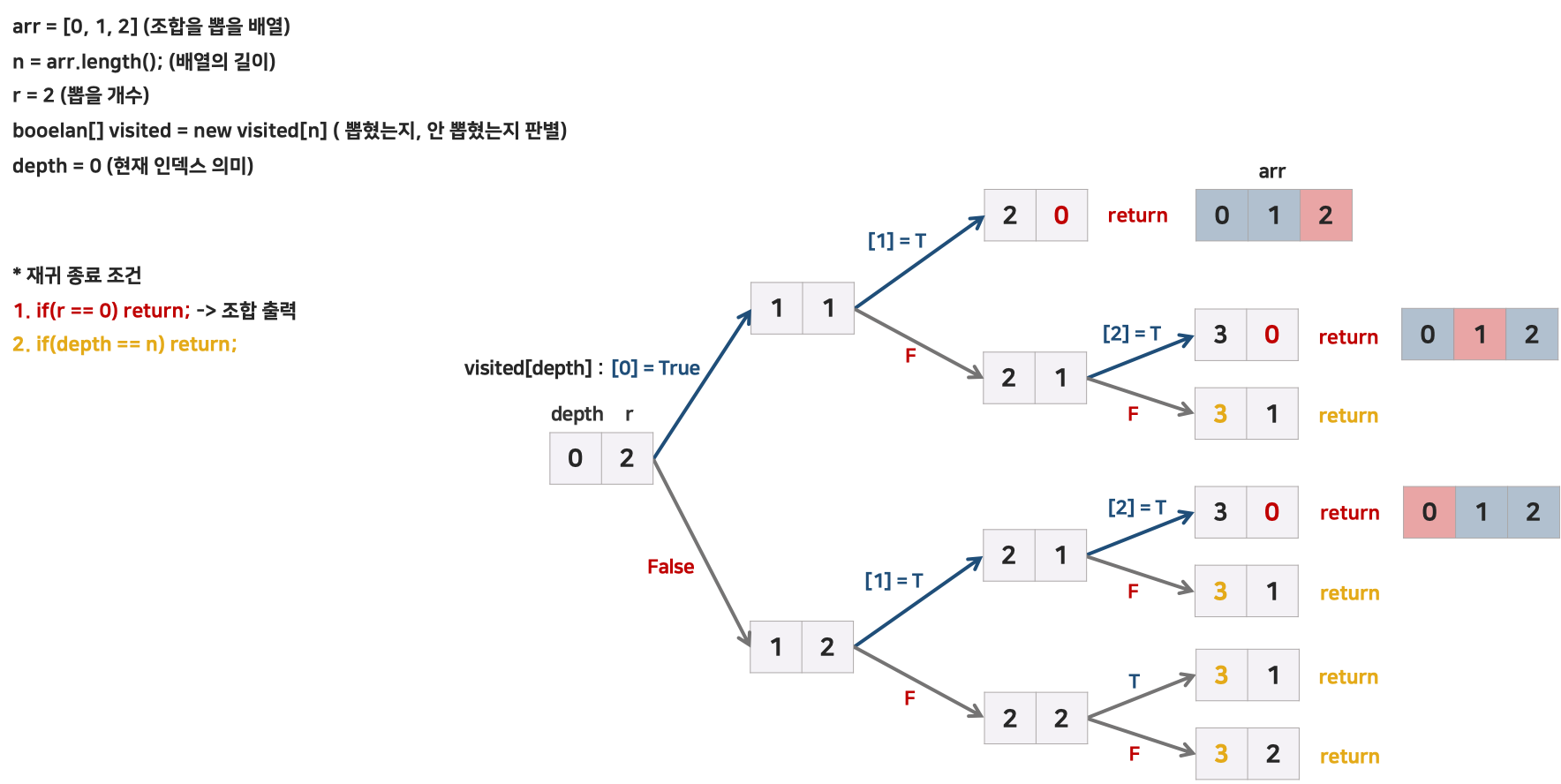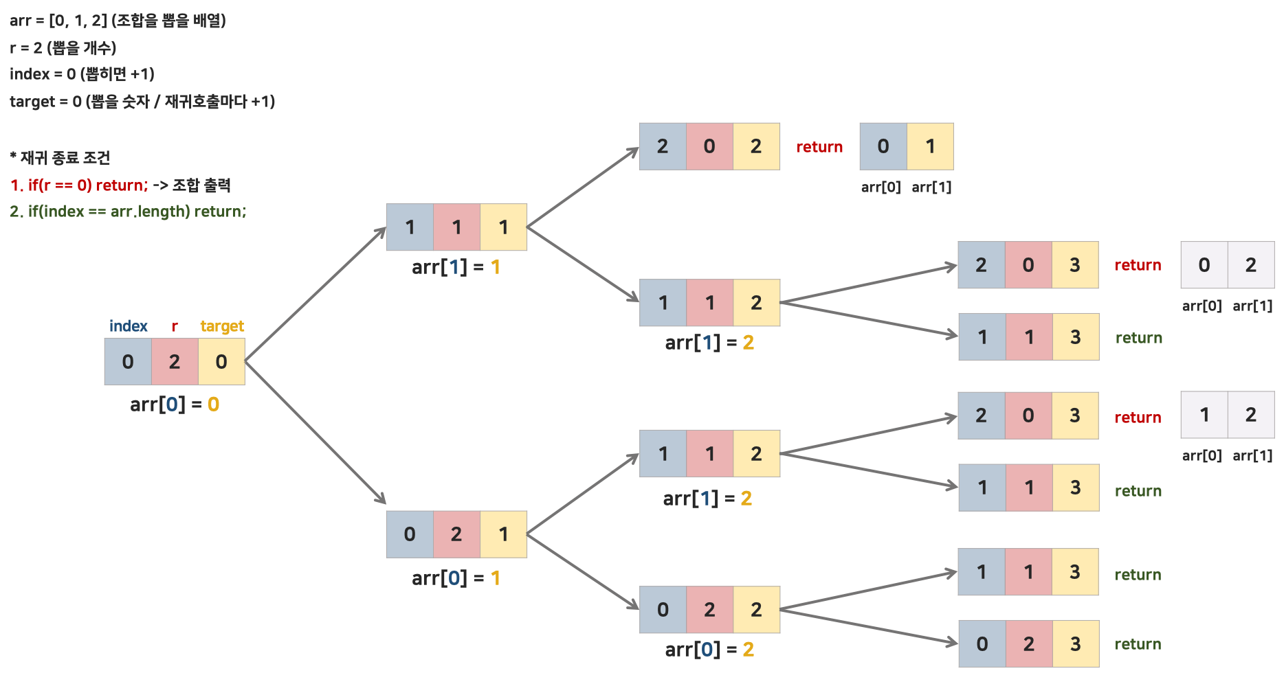 또한 r == 0이 되면 뽑을 개수를 다 뽑아 조합이 완성되으니 재귀를 종료한다.
