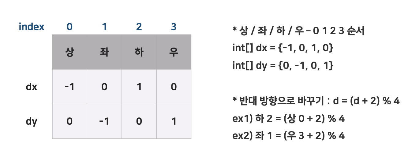 이런 식으로 dx, dy의 방향에 따른 인덱스 값을 현재 좌표 값에 더해서 위치를 간단히 이동시킬 수 있다!