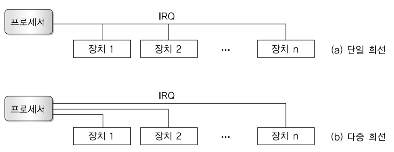 단일 회선 : 인터럽트 요청이 가능한 모든 장치를 공통으로 프로세서에 연결하는 방법(어느 장치가 인터럽트를 요청했는지 판별 필요)