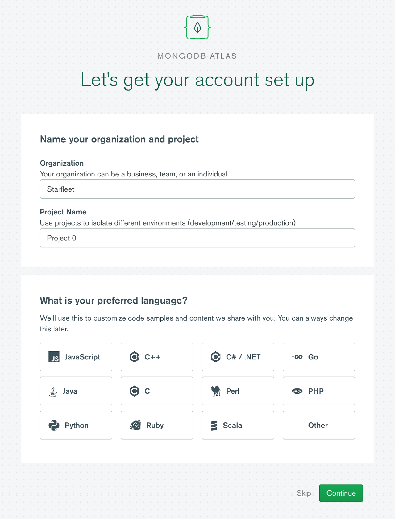 - 프롬프트에 따라 Atlas 계정에서 조직 및 프로젝트를 생성합니다. 기본 제안 이름을 사용하거나 직접 입력할 수 있습니다.
