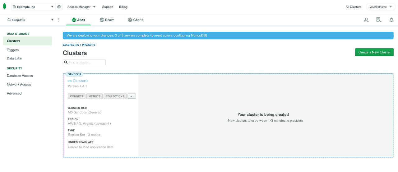 클러스터를 생성한 후 Atlas는 Atlas 계정에 대한 프로젝트 보기를 시작해야 합니다.