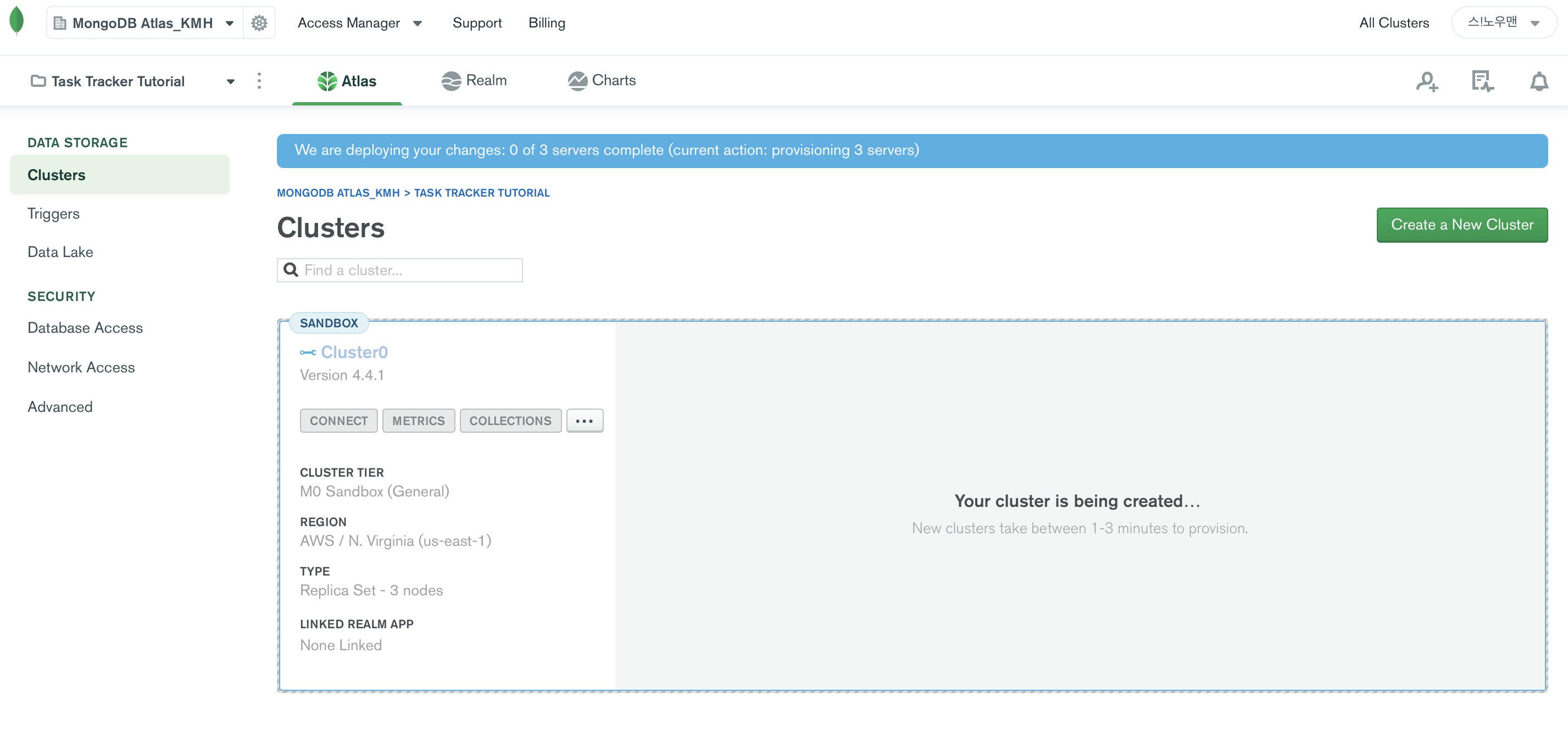 다음으로 MongoDB 4.4 이상을 실행하는 MongoDB Atlas 클러스터가 필요합니다.