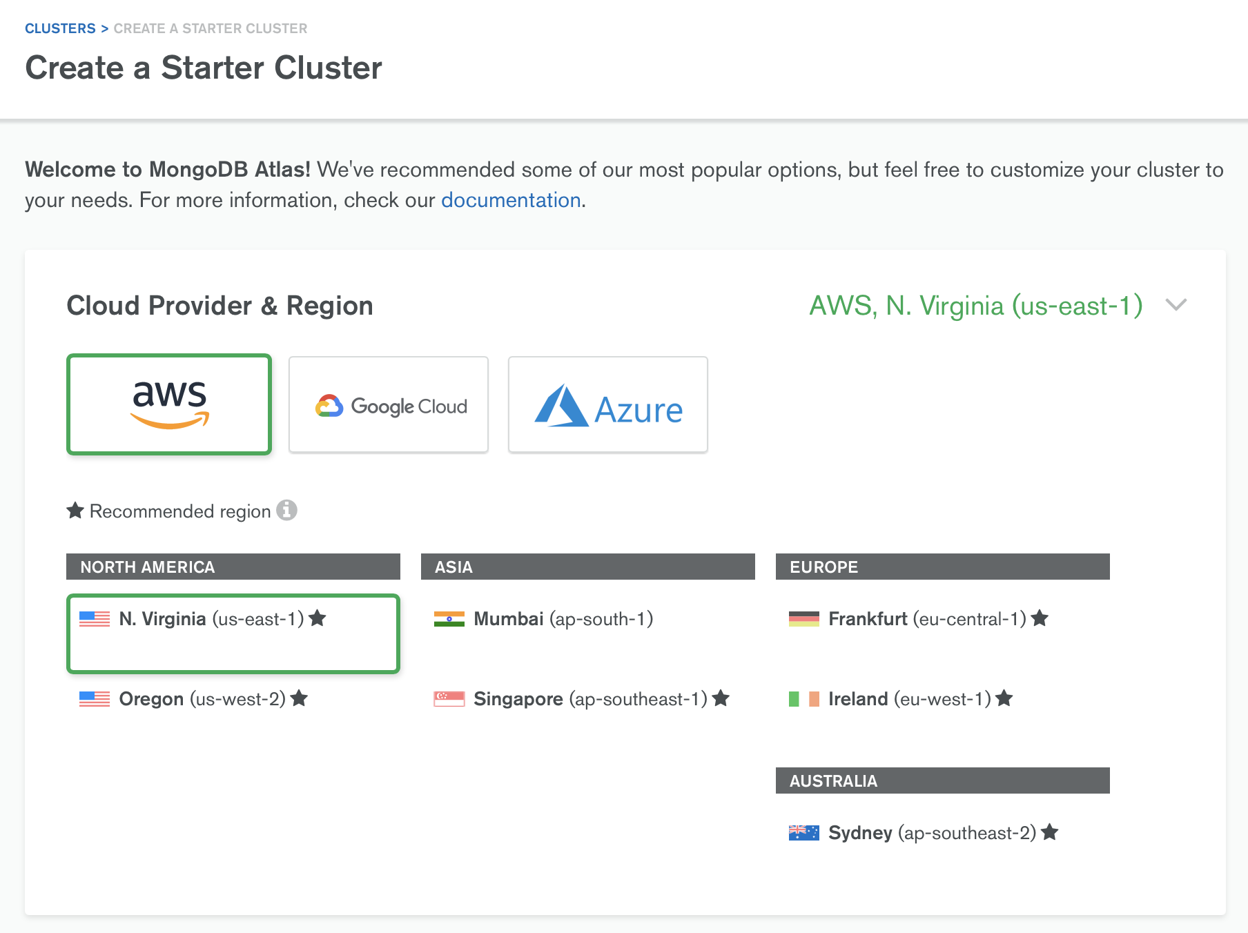 3. Cloud Provider & Region에서 AWS 및 N. Virginia (us-east-1)를 선택합니다.