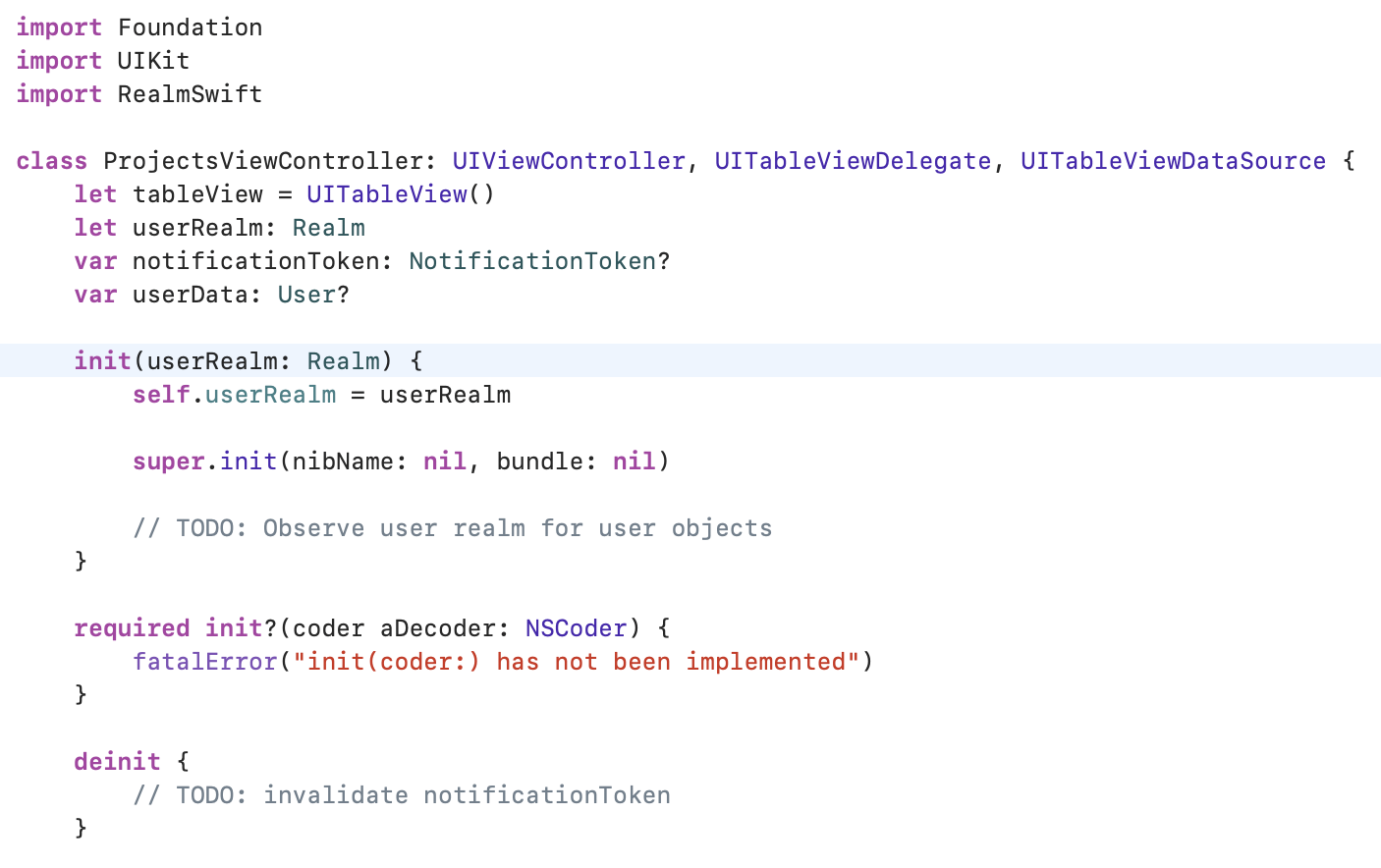 tableView(_:numberOfRowsInSection:)및 tableView(_:cellForRowAt:) 메서드에서 Task 클래스의 realm 객체 모델 버전과 RealmResults 객체가 클래스와 배열에서 각각 어떻게 drop-in replacements 되는지 확인하세요.