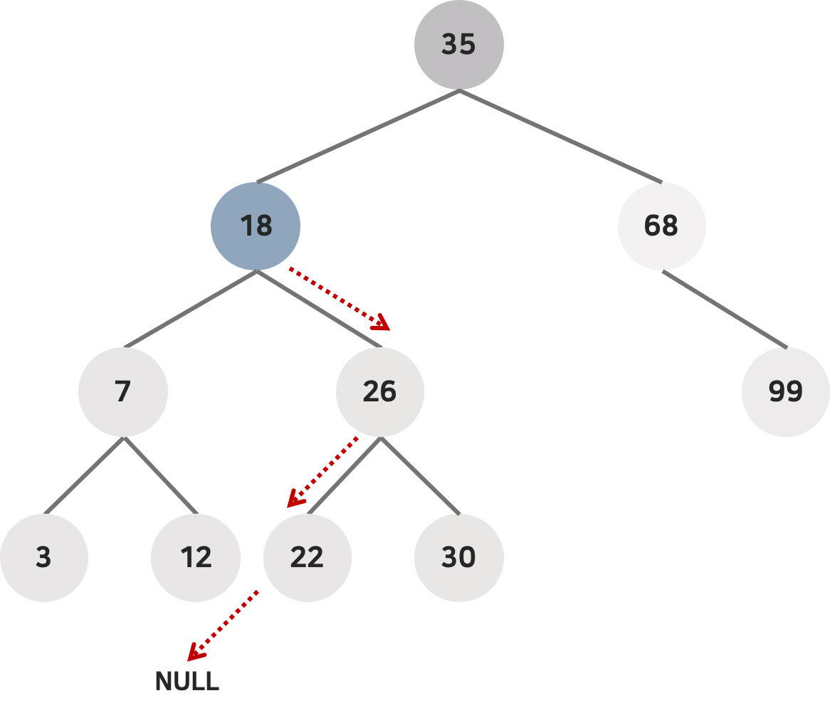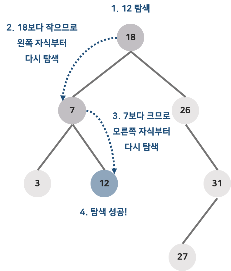 - 탐색키 값 > 루트 노드의 키 값 : 루트 노드의 오른쪽 자식 노드를 기준으로 재탐색