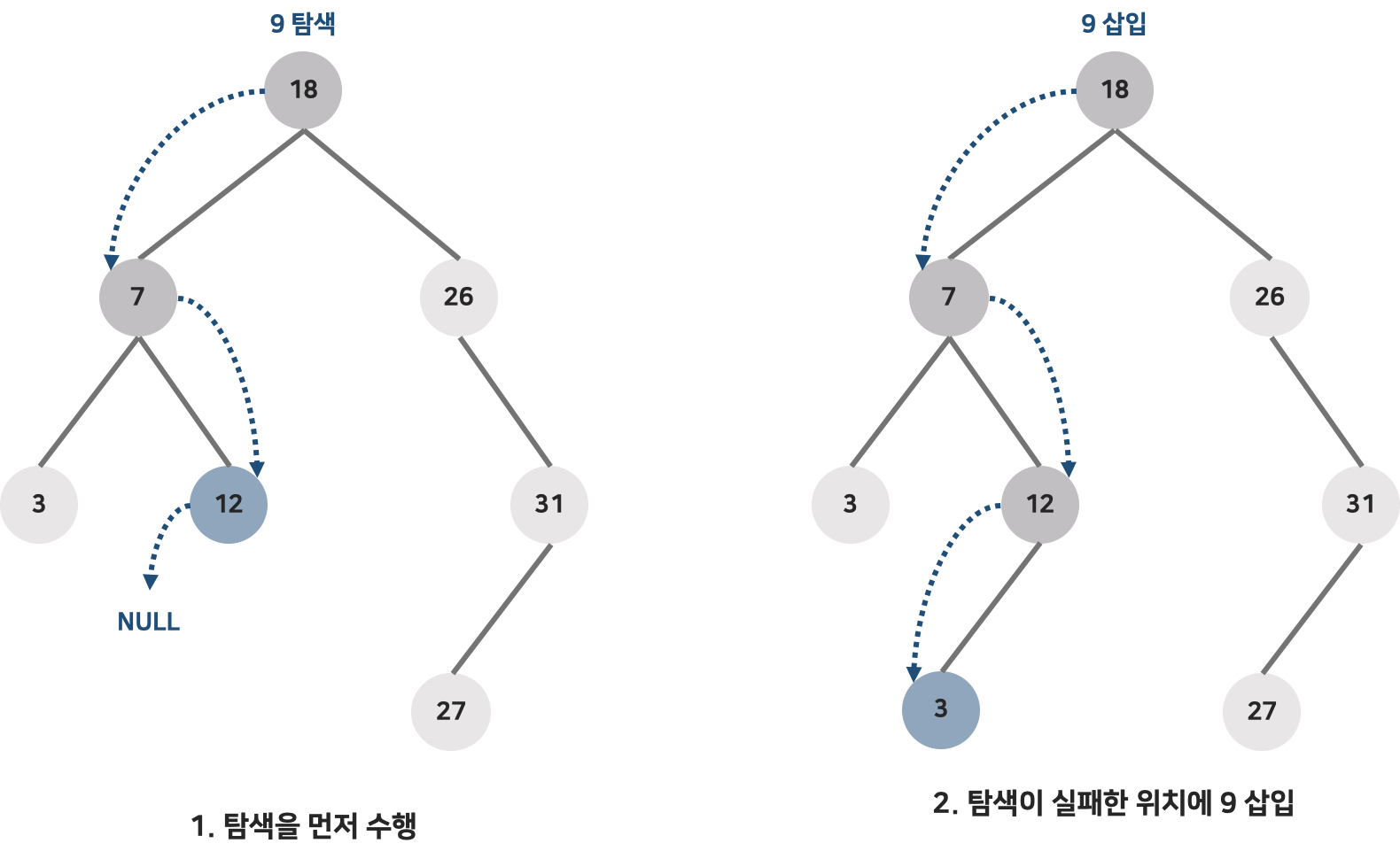 원소를 삽입하기 위해서는 먼저 탐색을 수행해야 한다.