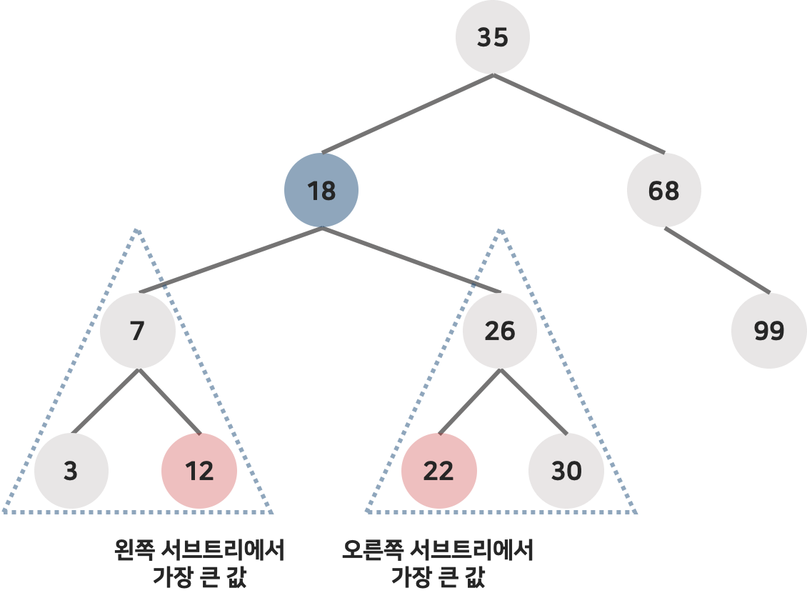 왼쪽 서브 트리의 가장 큰 값 - 왼쪽 서브트리에서 가장 오른쪽에 있는 노드