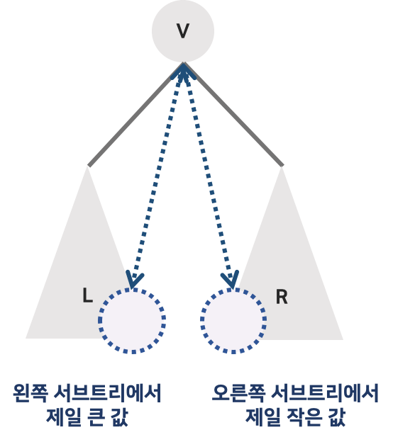 왼쪽 서브 트리에서 가장 큰 값이나 오른쪽 서브트리에서 가장 작은 값이 삭제되는 노드와 가장 가깝다.