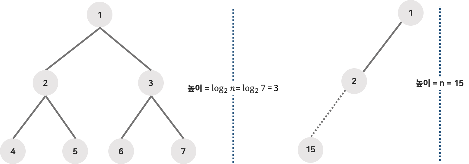 따라서 이러한 최악의 경우를 방지하기 위해 트리의 높이를 [log 2 n]으로 한정시키는 균형 기법이 필요하다. (ex. AVL 트리 등)