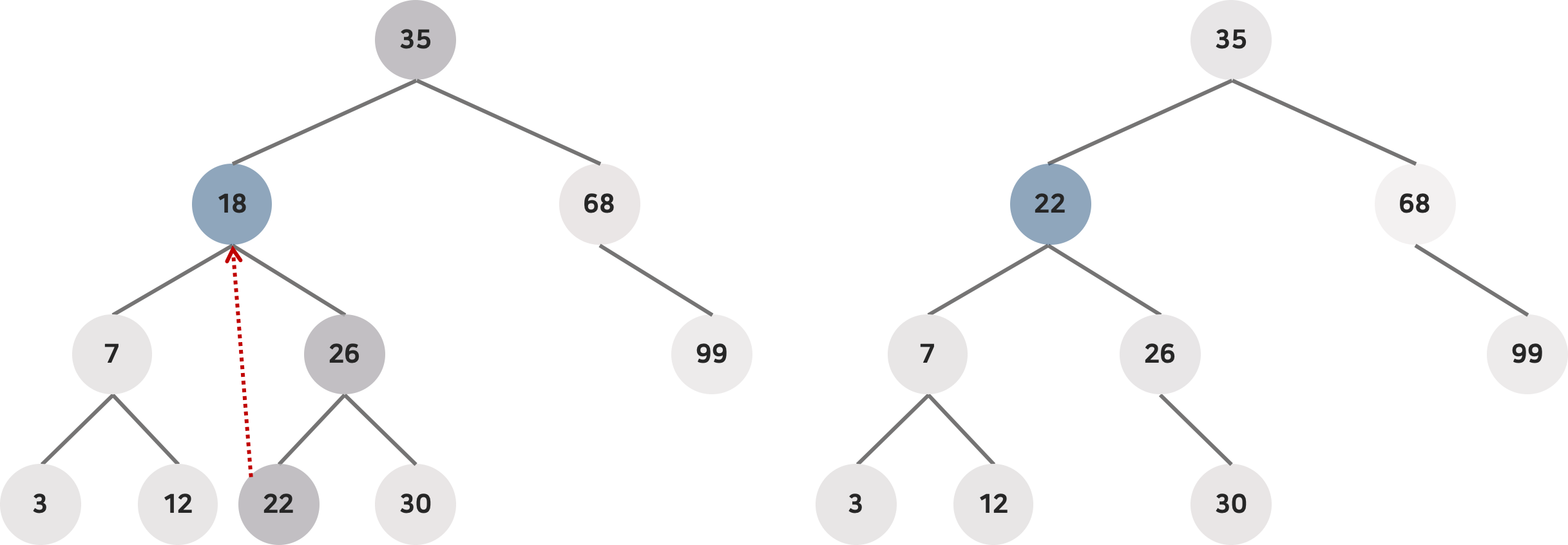 예를 들어 삭제 노드가 18일 경우, 후계자가 될 수 있는 노드는 12와 22가 된다.
