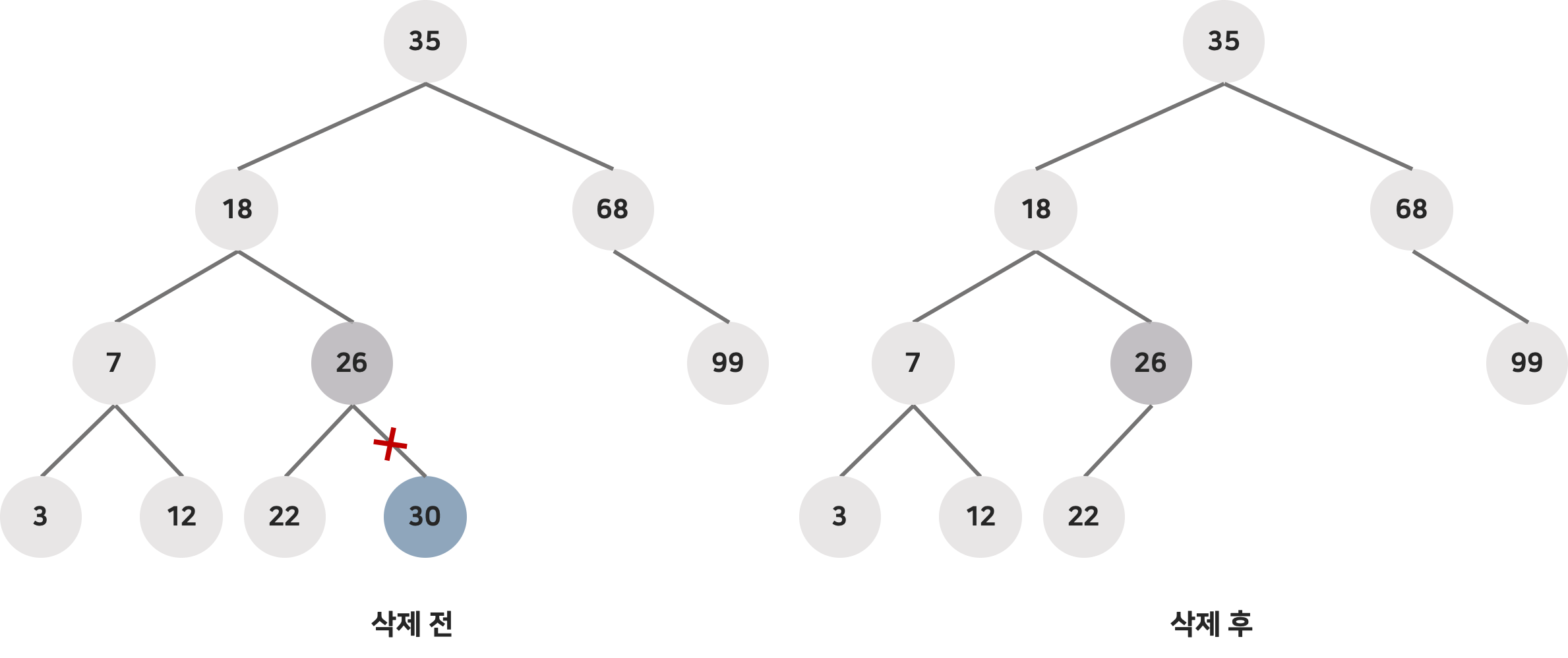 단말 노드 아래에는 더 이상의 노드가 없으므로 단말 노드만 지우면 된다.